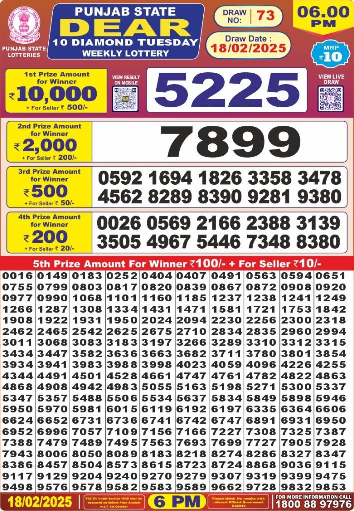 Punjab state dear 10 diamond weekly lottery 6 pm result 18-2-25