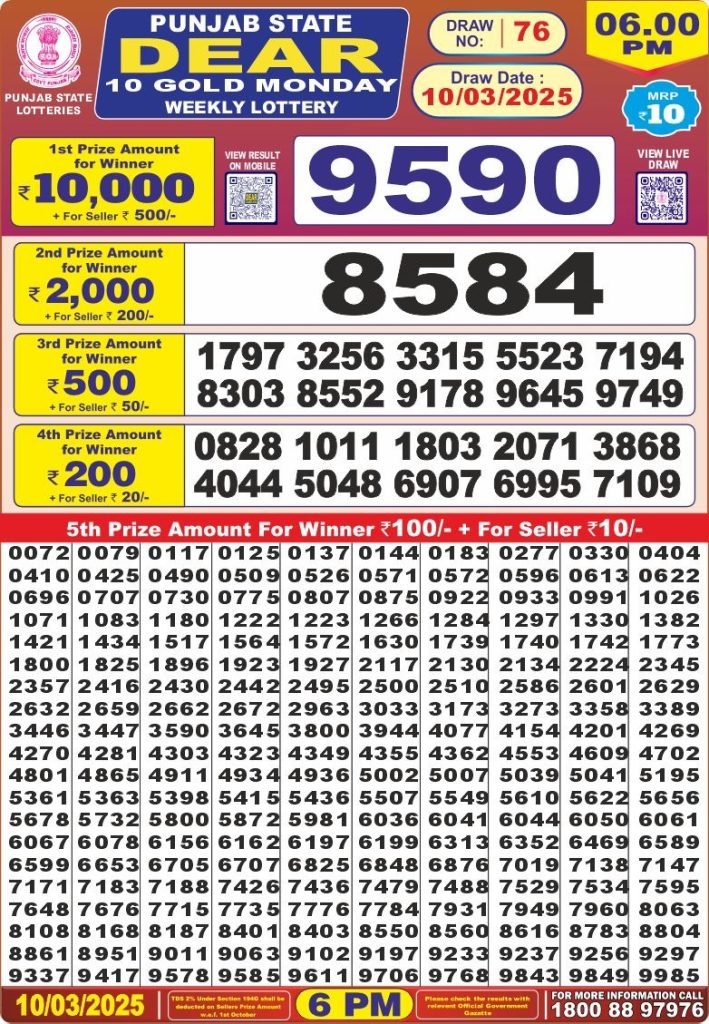 Punjab state dear 10 gold monday weekly lottery 10-3-25 site editor March 10, 2025 Leave a Comment on Punjab state dear 10 gold monday weekly lottery 10-3-25 Posted in Results Share: XFacebookPinterestRedditVKDiggLinkedinMix Related Results Punjab State Dear 200 Monthly Lottery 6pm Result 07-02-26 Punjab State Lohri Bumper Lottery Result 2026 Live Updates Dear X-Mas Bumper 6pm Lottery Result 27-12-25 Punjab State Dear 100 Monthly Lottery 7pm Result 09-12-25 Punjab State Lottery Dear 100 Monthly 7pm Result 11-11-2025 Dear 2000 Monthly Lottery 7pm Result 08-11-25 Check Now Dear Puja Bumper Lottery Result 11-10-25 Publish Author: site editor
