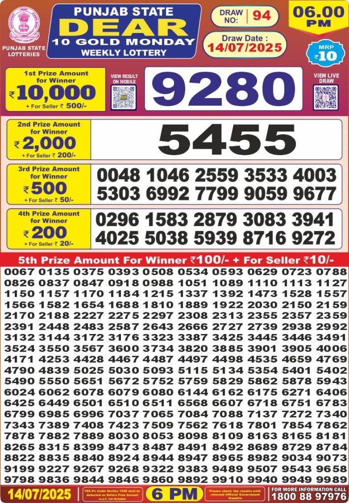 Punjab state dear 10 gold monday weekly lottery 14-7-25 Results Editorial Staff July 14, 2025 Leave a Comment on Punjab state dear 10 gold monday weekly lottery 14-7-25 Posted in Dear Lottery 6 PM Result Share: XFacebookPinterestRedditVKDiggLinkedinMix Dear Legend Monday Weekly Lottery Result Update 📅 Date: 14 July 2025 ⏰ Draw Time: 6:00 PM 🟢 Result Declared 🔗 View previous Dear Lottery 6 PM Result results Related Results Dear Legend Monday Weekly Lottery 6pm Result 02-03-26 Dear Empire Sunday Weekly Lottery 6pm Result 01-03-26 Dear Elite Saturday Weekly Lottery 6pm Result 28-02-26 Dear Crown Friday Weekly Lottery 6pm Result 27-02-26 Dear Supreme Thursday Weekly Lottery 6pm Result 26-02-26 Dear Regal Wednesday Weekly Lottery 6pm Result 25-02-26 Dear Prestige Tuesday Weekly Lottery 6pm Result 24-02-26 Author: Results Editorial Staff