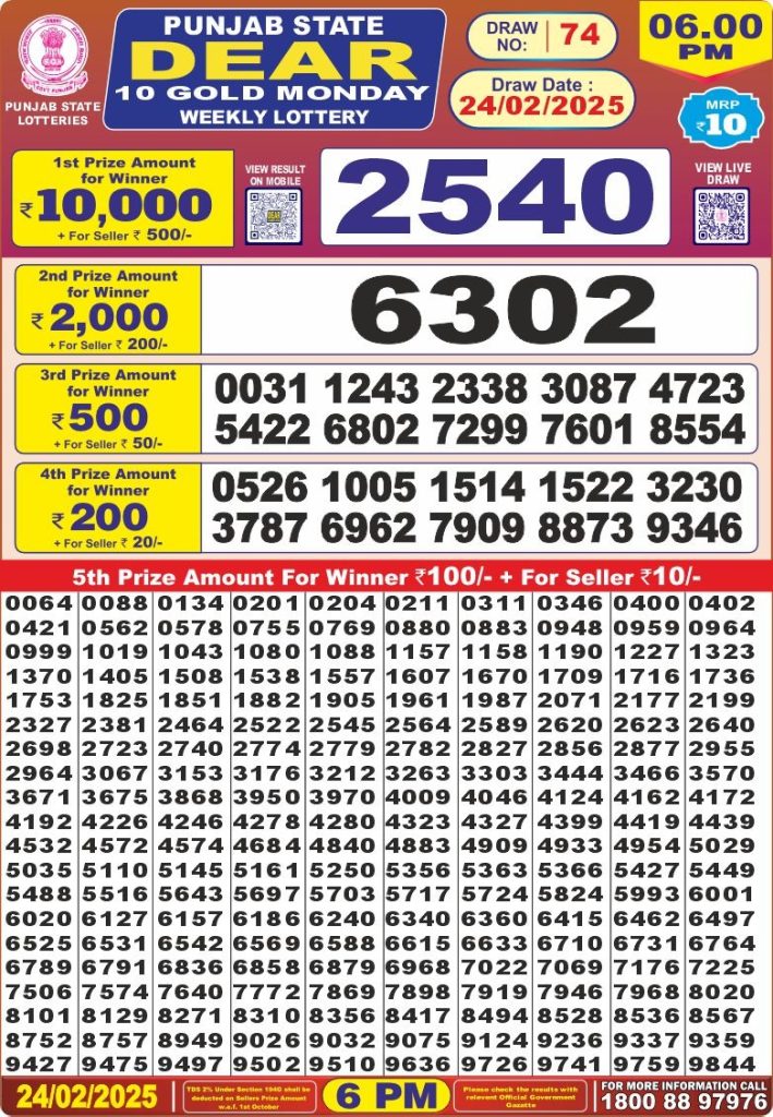 Punjab state dear 10 gold monday weekly lottery 6 pm result 24-2-25