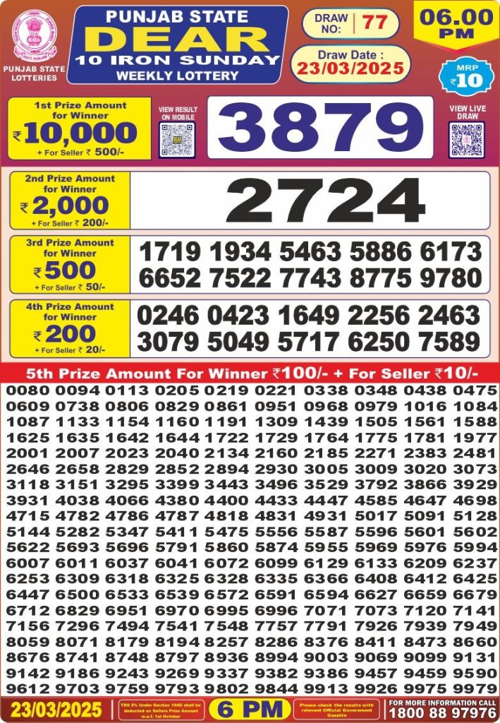 Punjab state dear 10 iron sunday weekly lottery 6 pm result 23-3-25 Results Editorial Staff March 23, 2025 Leave a Comment on Punjab state dear 10 iron sunday weekly lottery 6 pm result 23-3-25 Posted in Dear Lottery 6 PM Result Share: XFacebookPinterestRedditVKDiggLinkedinMix Dear Empire Sunday Weekly Lottery Result Update 📅 Date: 23 March 2025 ⏰ Draw Time: 6:00 PM 🟢 Result Declared 🔗 View previous Dear Lottery 6 PM Result results Related Results Dear Legend Monday Weekly Lottery 6pm Result 02-03-26 Dear Empire Sunday Weekly Lottery 6pm Result 01-03-26 Dear Elite Saturday Weekly Lottery 6pm Result 28-02-26 Dear Crown Friday Weekly Lottery 6pm Result 27-02-26 Dear Supreme Thursday Weekly Lottery 6pm Result 26-02-26 Dear Regal Wednesday Weekly Lottery 6pm Result 25-02-26 Dear Prestige Tuesday Weekly Lottery 6pm Result 24-02-26 Author: Results Editorial Staff