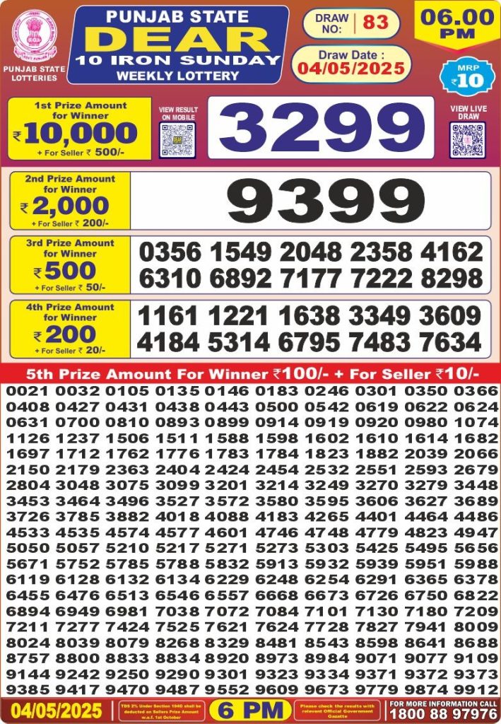 Punjab state dear 10 iron sunday weekly lottery 6 pm result 4-5-25 Results Editorial Staff May 4, 2025 Leave a Comment on Punjab state dear 10 iron sunday weekly lottery 6 pm result 4-5-25 Posted in Dear Lottery 6 PM Result Share: XFacebookPinterestRedditVKDiggLinkedinMix Dear Legend Monday Weekly Lottery Result Update 📅 Date: 04 May 2025 ⏰ Draw Time: 6:00 PM 🟢 Result Declared 🔗 View previous Dear Lottery 6 PM Result results Related Results Dear Legend Monday Weekly Lottery 6pm Result 02-03-26 Dear Empire Sunday Weekly Lottery 6pm Result 01-03-26 Dear Elite Saturday Weekly Lottery 6pm Result 28-02-26 Dear Crown Friday Weekly Lottery 6pm Result 27-02-26 Dear Supreme Thursday Weekly Lottery 6pm Result 26-02-26 Dear Regal Wednesday Weekly Lottery 6pm Result 25-02-26 Dear Prestige Tuesday Weekly Lottery 6pm Result 24-02-26 Author: Results Editorial Staff