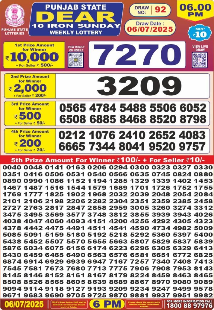 Punjab state dear 10 iron sunday weekly lottery 6 pm result 6-7-25 Results Editorial Staff July 6, 2025 Leave a Comment on Punjab state dear 10 iron sunday weekly lottery 6 pm result 6-7-25 Posted in Dear Lottery 6 PM Result Share: XFacebookPinterestRedditVKDiggLinkedinMix Dear Legend Monday Weekly Lottery Result Update 📅 Date: 06 July 2025 ⏰ Draw Time: 6:00 PM 🟢 Result Declared 🔗 View previous Dear Lottery 6 PM Result results Related Results Dear Legend Monday Weekly Lottery 6pm Result 02-03-26 Dear Empire Sunday Weekly Lottery 6pm Result 01-03-26 Dear Elite Saturday Weekly Lottery 6pm Result 28-02-26 Dear Crown Friday Weekly Lottery 6pm Result 27-02-26 Dear Supreme Thursday Weekly Lottery 6pm Result 26-02-26 Dear Regal Wednesday Weekly Lottery 6pm Result 25-02-26 Dear Prestige Tuesday Weekly Lottery 6pm Result 24-02-26 Author: Results Editorial Staff