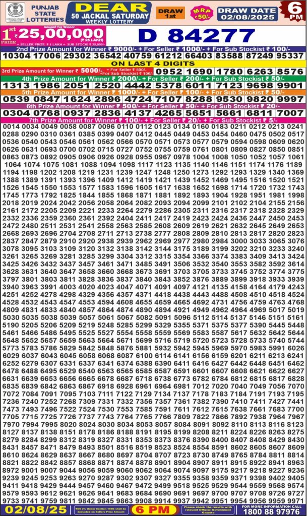 Punjab State Dear 50 Jackal Saturday Weekly Lottery 6 PM Result 02-08-25 wpailnadmin August 2, 2025 Leave a Comment on Punjab State Dear 50 Jackal Saturday Weekly Lottery 6 PM Result 02-08-25 Posted in Dear Lottery 6 PM Result Share: XFacebookPinterestRedditVKDiggLinkedinMix Dear Legend Monday Weekly Lottery Result Update 📅 Date: 02 August 2025 ⏰ Draw Time: 6:00 PM 🟢 Result Declared 🔗 View previous Dear Lottery 6 PM Result results Related Results Dear Legend Monday Weekly Lottery 6pm Result 02-03-26 Dear Empire Sunday Weekly Lottery 6pm Result 01-03-26 Dear Elite Saturday Weekly Lottery 6pm Result 28-02-26 Dear Crown Friday Weekly Lottery 6pm Result 27-02-26 Dear Supreme Thursday Weekly Lottery 6pm Result 26-02-26 Dear Regal Wednesday Weekly Lottery 6pm Result 25-02-26 Dear Prestige Tuesday Weekly Lottery 6pm Result 24-02-26 Author: wpailnadmin Website