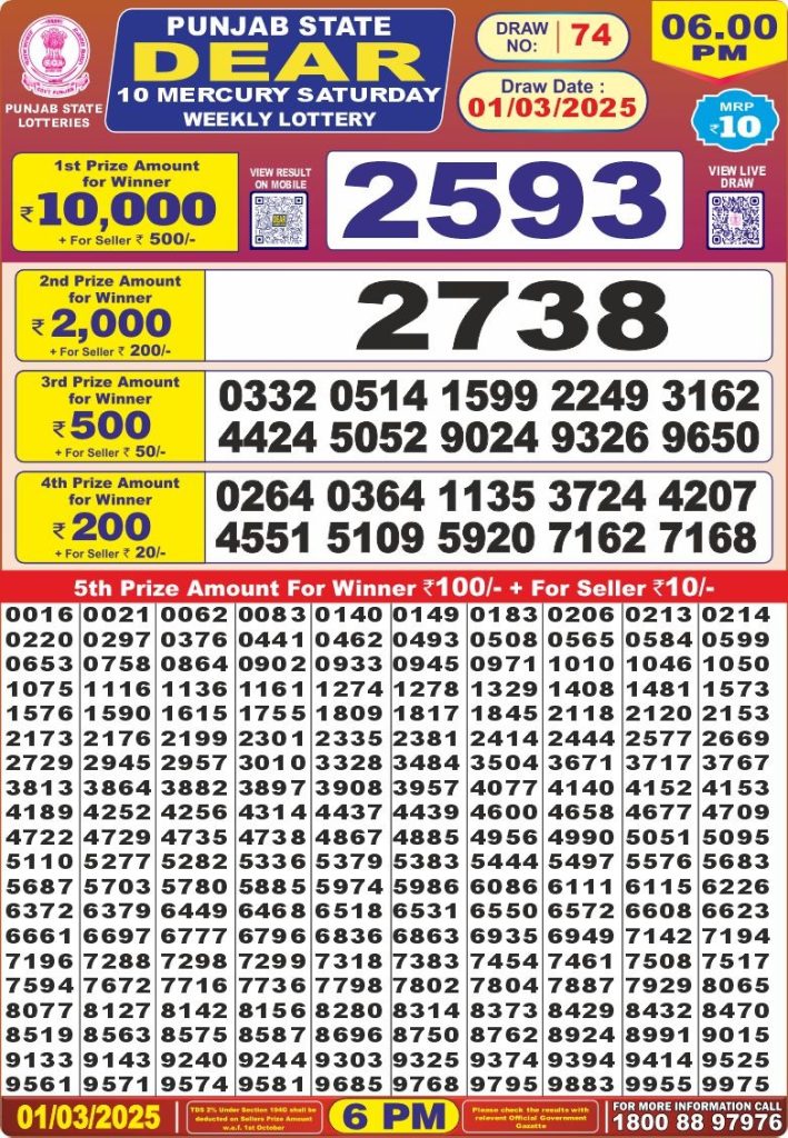 Punjab state dear 10 mercury Saturday weekly lottery 6 pm result 1-3-25 site editor March 1, 2025 Leave a Comment on Punjab state dear 10 mercury Saturday weekly lottery 6 pm result 1-3-25 Posted in Dear Lottery 6 PM Result Share: XFacebookPinterestRedditVKDiggLinkedinMix Dear Legend Monday Weekly Lottery Result Update 📅 Date: 01 March 2025 ⏰ Draw Time: 6:00 PM 🟢 Result Declared 🔗 View previous Dear Lottery 6 PM Result results Related Results Dear Legend Monday Weekly Lottery 6pm Result 02-03-26 Dear Empire Sunday Weekly Lottery 6pm Result 01-03-26 Dear Elite Saturday Weekly Lottery 6pm Result 28-02-26 Dear Crown Friday Weekly Lottery 6pm Result 27-02-26 Dear Supreme Thursday Weekly Lottery 6pm Result 26-02-26 Dear Regal Wednesday Weekly Lottery 6pm Result 25-02-26 Dear Prestige Tuesday Weekly Lottery 6pm Result 24-02-26 Author: site editor