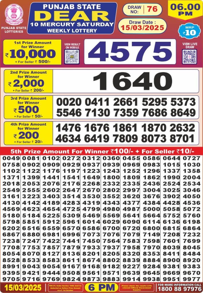 Punjab state dear 10 mercury Saturday weekly lottery 6 pm result 15-3-25 site editor March 15, 2025 Leave a Comment on Punjab state dear 10 mercury Saturday weekly lottery 6 pm result 15-3-25 Posted in Results Share: XFacebookPinterestRedditVKDiggLinkedinMix Related Results Punjab State Dear 200 Monthly Lottery 6pm Result 07-02-26 Punjab State Lohri Bumper Lottery Result 2026 Live Updates Dear X-Mas Bumper 6pm Lottery Result 27-12-25 Punjab State Dear 100 Monthly Lottery 7pm Result 09-12-25 Punjab State Lottery Dear 100 Monthly 7pm Result 11-11-2025 Dear 2000 Monthly Lottery 7pm Result 08-11-25 Check Now Dear Puja Bumper Lottery Result 11-10-25 Publish Author: site editor