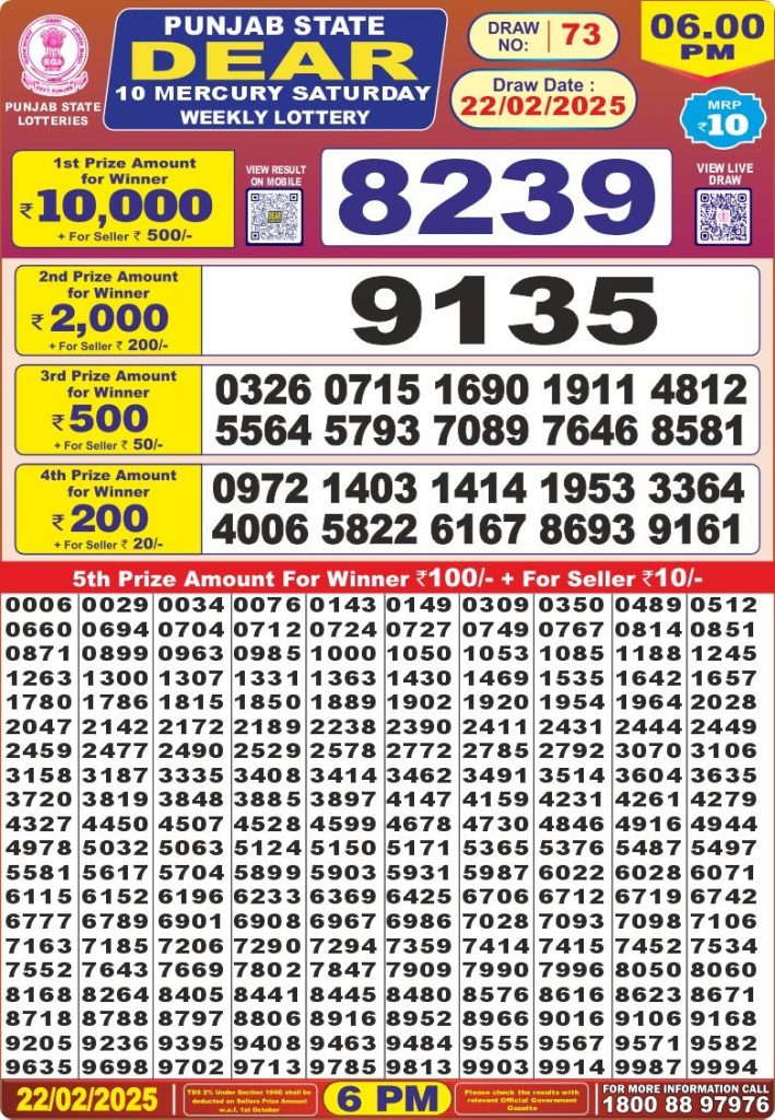 Punjab state dear 10 mercury Saturday weekly lottery 6 pm result 22-2-25