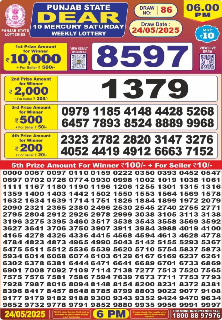 Punjab state dear 10 mercury Saturday weekly lottery 6 pm result 24-5-25 Results Editorial Staff May 24, 2025 Leave a Comment on Punjab state dear 10 mercury Saturday weekly lottery 6 pm result 24-5-25 Posted in Dear Lottery 6 PM Result Share: XFacebookPinterestRedditVKDiggLinkedinMix Dear Legend Monday Weekly Lottery Result Update 📅 Date: 24 May 2025 ⏰ Draw Time: 6:00 PM 🟢 Result Declared 🔗 View previous Dear Lottery 6 PM Result results Related Results Dear Legend Monday Weekly Lottery 6pm Result 02-03-26 Dear Empire Sunday Weekly Lottery 6pm Result 01-03-26 Dear Elite Saturday Weekly Lottery 6pm Result 28-02-26 Dear Crown Friday Weekly Lottery 6pm Result 27-02-26 Dear Supreme Thursday Weekly Lottery 6pm Result 26-02-26 Dear Regal Wednesday Weekly Lottery 6pm Result 25-02-26 Dear Prestige Tuesday Weekly Lottery 6pm Result 24-02-26 Author: Results Editorial Staff