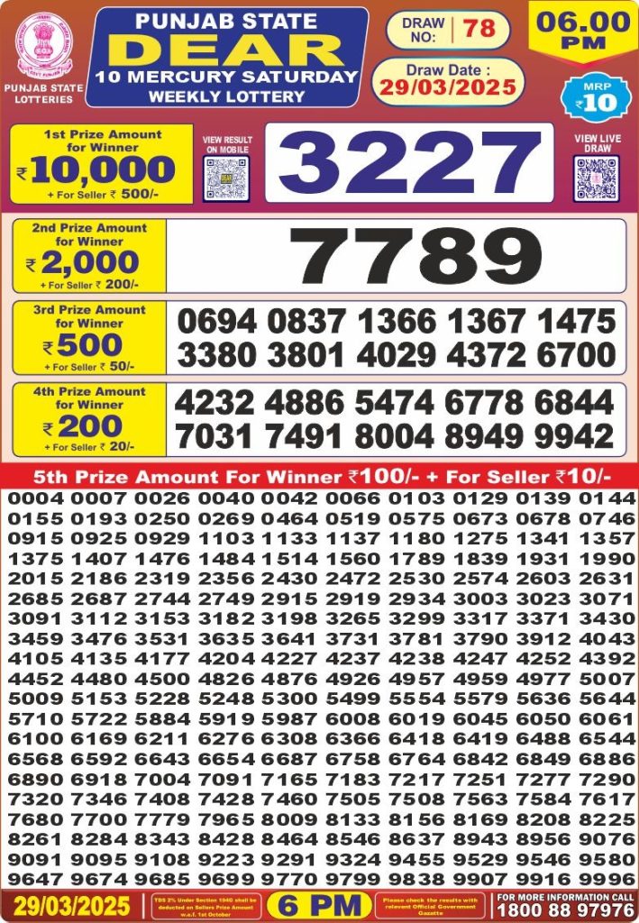 Punjab state dear 10 mercury Saturday weekly lottery 6 pm result 29-3-25