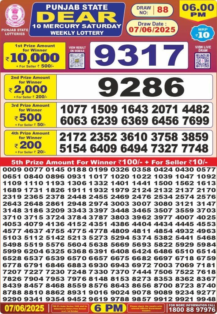 Punjab state dear 10 mercury Saturday weekly lottery 6 pm result 7-6-25 Results Editorial Staff June 7, 2025 Leave a Comment on Punjab state dear 10 mercury Saturday weekly lottery 6 pm result 7-6-25 Posted in Dear Lottery 6 PM Result Share: XFacebookPinterestRedditVKDiggLinkedinMix Dear Legend Monday Weekly Lottery Result Update 📅 Date: 07 June 2025 ⏰ Draw Time: 6:00 PM 🟢 Result Declared 🔗 View previous Dear Lottery 6 PM Result results Related Results Dear Legend Monday Weekly Lottery 6pm Result 02-03-26 Dear Empire Sunday Weekly Lottery 6pm Result 01-03-26 Dear Elite Saturday Weekly Lottery 6pm Result 28-02-26 Dear Crown Friday Weekly Lottery 6pm Result 27-02-26 Dear Supreme Thursday Weekly Lottery 6pm Result 26-02-26 Dear Regal Wednesday Weekly Lottery 6pm Result 25-02-26 Dear Prestige Tuesday Weekly Lottery 6pm Result 24-02-26 Author: Results Editorial Staff