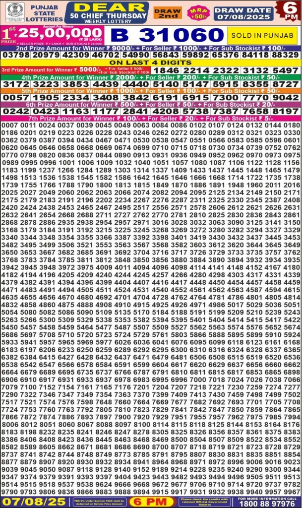 Punjab State Dear 50 chief Thursday Weekly Lottery 6 PM Result 07-08-25 wpailnadmin August 7, 2025 Leave a Comment on Punjab State Dear 50 chief Thursday Weekly Lottery 6 PM Result 07-08-25 Posted in Dear Lottery 6 PM Result Share: XFacebookPinterestRedditVKDiggLinkedinMix Dear Legend Monday Weekly Lottery Result Update 📅 Date: 07 August 2025 ⏰ Draw Time: 6:00 PM 🟢 Result Declared 🔗 View previous Dear Lottery 6 PM Result results Related Results Dear Legend Monday Weekly Lottery 6pm Result 02-03-26 Dear Empire Sunday Weekly Lottery 6pm Result 01-03-26 Dear Elite Saturday Weekly Lottery 6pm Result 28-02-26 Dear Crown Friday Weekly Lottery 6pm Result 27-02-26 Dear Supreme Thursday Weekly Lottery 6pm Result 26-02-26 Dear Regal Wednesday Weekly Lottery 6pm Result 25-02-26 Dear Prestige Tuesday Weekly Lottery 6pm Result 24-02-26 Author: wpailnadmin Website