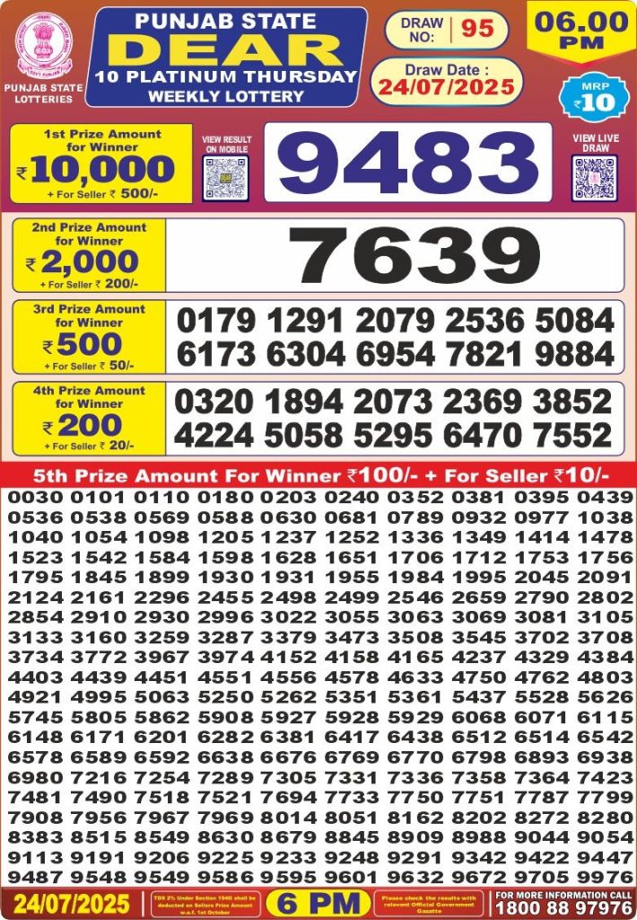 Punjab state dear 10 platinum Thursday weekly lottery 6 pm result 24-7-25 Results Editorial Staff July 24, 2025 Leave a Comment on Punjab state dear 10 platinum Thursday weekly lottery 6 pm result 24-7-25 Posted in Dear Lottery 6 PM Result Share: XFacebookPinterestRedditVKDiggLinkedinMix Dear Empire Sunday Weekly Lottery Result Update 📅 Date: 24 July 2025 ⏰ Draw Time: 6:00 PM 🟢 Result Declared 🔗 View previous Dear Lottery 6 PM Result results Related Results Dear Legend Monday Weekly Lottery 6pm Result 02-03-26 Dear Empire Sunday Weekly Lottery 6pm Result 01-03-26 Dear Elite Saturday Weekly Lottery 6pm Result 28-02-26 Dear Crown Friday Weekly Lottery 6pm Result 27-02-26 Dear Supreme Thursday Weekly Lottery 6pm Result 26-02-26 Dear Regal Wednesday Weekly Lottery 6pm Result 25-02-26 Dear Prestige Tuesday Weekly Lottery 6pm Result 24-02-26 Author: Results Editorial Staff