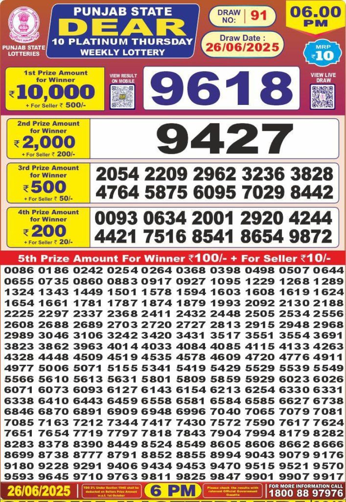 Punjab state dear 10 platinum Thursday weekly lottery 6 pm result 26-6-25 Results Editorial Staff June 26, 2025 Leave a Comment on Punjab state dear 10 platinum Thursday weekly lottery 6 pm result 26-6-25 Posted in Dear Lottery 6 PM Result Share: XFacebookPinterestRedditVKDiggLinkedinMix Dear Legend Monday Weekly Lottery Result Update 📅 Date: 26 June 2025 ⏰ Draw Time: 6:00 PM 🟢 Result Declared 🔗 View previous Dear Lottery 6 PM Result results Related Results Dear Legend Monday Weekly Lottery 6pm Result 02-03-26 Dear Empire Sunday Weekly Lottery 6pm Result 01-03-26 Dear Elite Saturday Weekly Lottery 6pm Result 28-02-26 Dear Crown Friday Weekly Lottery 6pm Result 27-02-26 Dear Supreme Thursday Weekly Lottery 6pm Result 26-02-26 Dear Regal Wednesday Weekly Lottery 6pm Result 25-02-26 Dear Prestige Tuesday Weekly Lottery 6pm Result 24-02-26 Author: Results Editorial Staff