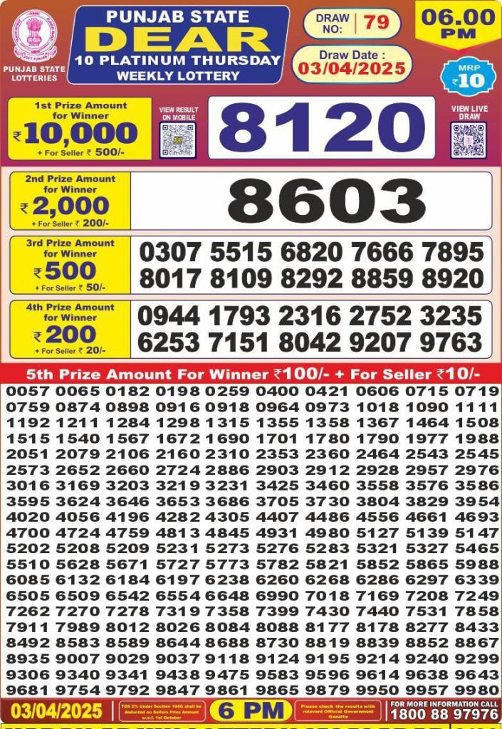 Punjab state dear 10 platinum Thursday weekly lottery 6 pm result 3-4-25 Results Editorial Staff April 3, 2025 Leave a Comment on Punjab state dear 10 platinum Thursday weekly lottery 6 pm result 3-4-25 Posted in Dear Lottery 6 PM Result Share: XFacebookPinterestRedditVKDiggLinkedinMix Dear Legend Monday Weekly Lottery Result Update 📅 Date: 03 April 2025 ⏰ Draw Time: 6:00 PM 🟢 Result Declared 🔗 View previous Dear Lottery 6 PM Result results Related Results Dear Legend Monday Weekly Lottery 6pm Result 02-03-26 Dear Empire Sunday Weekly Lottery 6pm Result 01-03-26 Dear Elite Saturday Weekly Lottery 6pm Result 28-02-26 Dear Crown Friday Weekly Lottery 6pm Result 27-02-26 Dear Supreme Thursday Weekly Lottery 6pm Result 26-02-26 Dear Regal Wednesday Weekly Lottery 6pm Result 25-02-26 Dear Prestige Tuesday Weekly Lottery 6pm Result 24-02-26 Author: Results Editorial Staff