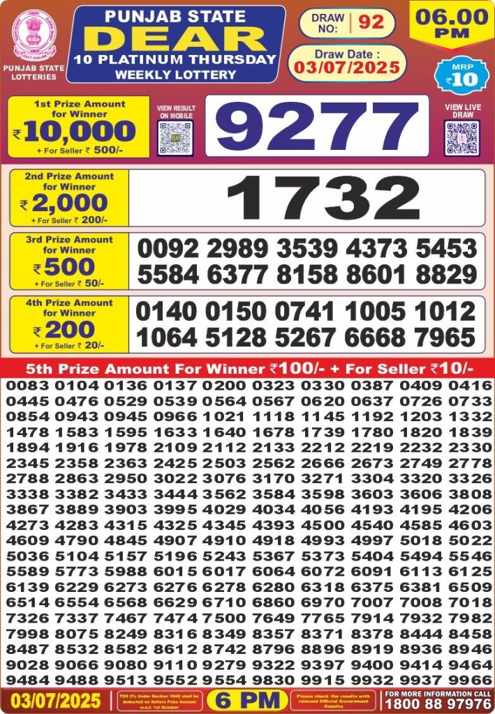 Punjab state dear 10 platinum Thursday weekly lottery 6 pm result 3-7-25 Results Editorial Staff July 3, 2025 Leave a Comment on Punjab state dear 10 platinum Thursday weekly lottery 6 pm result 3-7-25 Posted in Dear Lottery 6 PM Result Share: XFacebookPinterestRedditVKDiggLinkedinMix Dear Legend Monday Weekly Lottery Result Update 📅 Date: 03 July 2025 ⏰ Draw Time: 6:00 PM 🟢 Result Declared 🔗 View previous Dear Lottery 6 PM Result results Related Results Dear Legend Monday Weekly Lottery 6pm Result 02-03-26 Dear Empire Sunday Weekly Lottery 6pm Result 01-03-26 Dear Elite Saturday Weekly Lottery 6pm Result 28-02-26 Dear Crown Friday Weekly Lottery 6pm Result 27-02-26 Dear Supreme Thursday Weekly Lottery 6pm Result 26-02-26 Dear Regal Wednesday Weekly Lottery 6pm Result 25-02-26 Dear Prestige Tuesday Weekly Lottery 6pm Result 24-02-26 Author: Results Editorial Staff