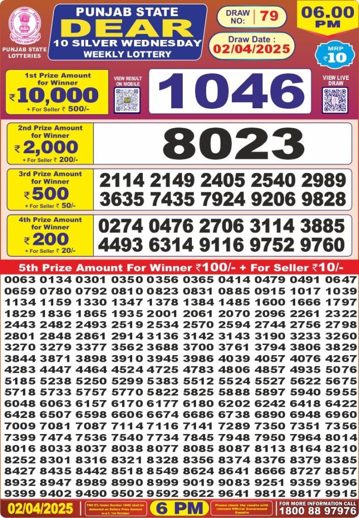 Punjab state dear 10 silver Wednesday weekly lottery 6 pm result 2-4-25 Results Editorial Staff April 2, 2025 Leave a Comment on Punjab state dear 10 silver Wednesday weekly lottery 6 pm result 2-4-25 Posted in Dear Lottery 6 PM Result Share: XFacebookPinterestRedditVKDiggLinkedinMix Dear Legend Monday Weekly Lottery Result Update 📅 Date: 02 April 2025 ⏰ Draw Time: 6:00 PM 🟢 Result Declared 🔗 View previous Dear Lottery 6 PM Result results Related Results Dear Legend Monday Weekly Lottery 6pm Result 02-03-26 Dear Empire Sunday Weekly Lottery 6pm Result 01-03-26 Dear Elite Saturday Weekly Lottery 6pm Result 28-02-26 Dear Crown Friday Weekly Lottery 6pm Result 27-02-26 Dear Supreme Thursday Weekly Lottery 6pm Result 26-02-26 Dear Regal Wednesday Weekly Lottery 6pm Result 25-02-26 Dear Prestige Tuesday Weekly Lottery 6pm Result 24-02-26 Author: Results Editorial Staff
