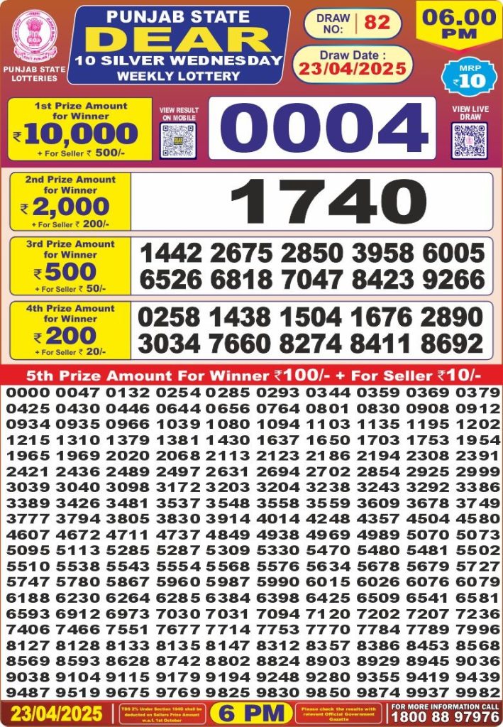 Punjab state dear 10 silver Wednesday weekly lottery 6 pm result 23-4-25 Results Editorial Staff April 23, 2025 Leave a Comment on Punjab state dear 10 silver Wednesday weekly lottery 6 pm result 23-4-25 Posted in Dear Lottery 6 PM Result Share: XFacebookPinterestRedditVKDiggLinkedinMix Dear Legend Monday Weekly Lottery Result Update 📅 Date: 23 April 2025 ⏰ Draw Time: 6:00 PM 🟢 Result Declared 🔗 View previous Dear Lottery 6 PM Result results Related Results Dear Legend Monday Weekly Lottery 6pm Result 02-03-26 Dear Empire Sunday Weekly Lottery 6pm Result 01-03-26 Dear Elite Saturday Weekly Lottery 6pm Result 28-02-26 Dear Crown Friday Weekly Lottery 6pm Result 27-02-26 Dear Supreme Thursday Weekly Lottery 6pm Result 26-02-26 Dear Regal Wednesday Weekly Lottery 6pm Result 25-02-26 Dear Prestige Tuesday Weekly Lottery 6pm Result 24-02-26 Author: Results Editorial Staff