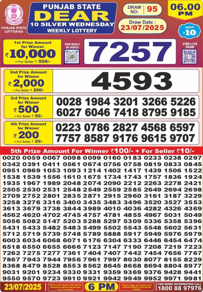 Punjab state dear 10 silver Wednesday weekly lottery 6 pm result 23-7-25 Results Editorial Staff July 23, 2025 Leave a Comment on Punjab state dear 10 silver Wednesday weekly lottery 6 pm result 23-7-25 Posted in Dear Lottery 6 PM Result Share: XFacebookPinterestRedditVKDiggLinkedinMix Dear Legend Monday Weekly Lottery Result Update 📅 Date: 23 July 2025 ⏰ Draw Time: 6:00 PM 🟢 Result Declared 🔗 View previous Dear Lottery 6 PM Result results Related Results Dear Legend Monday Weekly Lottery 6pm Result 02-03-26 Dear Empire Sunday Weekly Lottery 6pm Result 01-03-26 Dear Elite Saturday Weekly Lottery 6pm Result 28-02-26 Dear Crown Friday Weekly Lottery 6pm Result 27-02-26 Dear Supreme Thursday Weekly Lottery 6pm Result 26-02-26 Dear Regal Wednesday Weekly Lottery 6pm Result 25-02-26 Dear Prestige Tuesday Weekly Lottery 6pm Result 24-02-26 Author: Results Editorial Staff