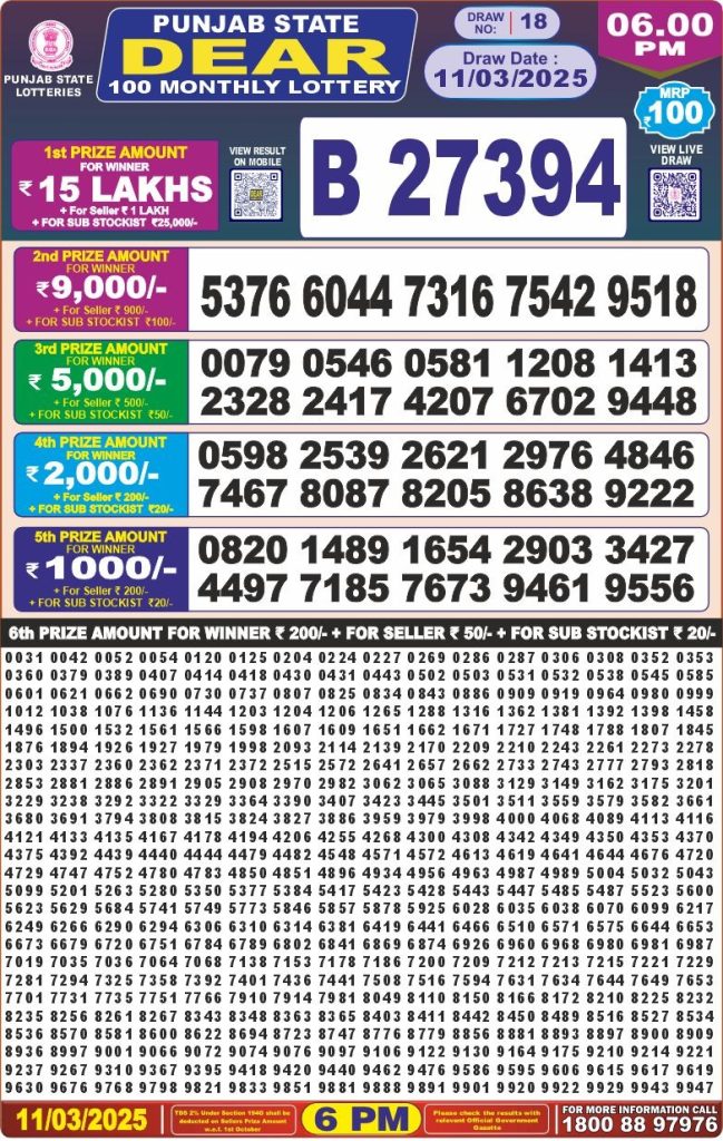 Punjab state dear 100 monthly Lottery 6 pm result 11-3-25 site editor March 11, 2025 Leave a Comment on Punjab state dear 100 monthly Lottery 6 pm result 11-3-25 Posted in Results Share: XFacebookPinterestRedditVKDiggLinkedinMix Related Results Punjab State Dear 200 Monthly Lottery 6pm Result 07-02-26 Punjab State Lohri Bumper Lottery Result 2026 Live Updates Dear X-Mas Bumper 6pm Lottery Result 27-12-25 Punjab State Dear 100 Monthly Lottery 7pm Result 09-12-25 Punjab State Lottery Dear 100 Monthly 7pm Result 11-11-2025 Dear 2000 Monthly Lottery 7pm Result 08-11-25 Check Now Dear Puja Bumper Lottery Result 11-10-25 Publish Author: site editor