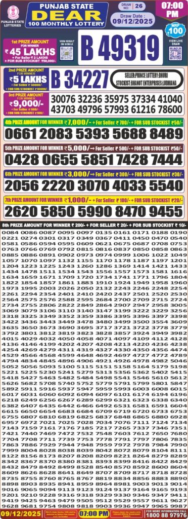 Punjab State Dear 100 Monthly Lottery 7pm Result 09-12-25