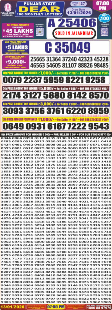 Punjab State Dear 100 Monthly Lottery 7pm Result 13-01-26 Results Editorial Staff January 13, 2026 Leave a Comment on Punjab State Dear 100 Monthly Lottery 7pm Result 13-01-26 Posted in Monthly Share: XFacebookPinterestRedditVKDiggLinkedinMix Related Results Punjab State Dear 100 Monthly Lottery 7pm Result 10-02-26 Punjab State Dear 200 Monthly Lottery 6pm Result 07-02-26 Punjab State Dear 20 Monthly Lottery 7pm Result 27-01-26 Punjab State Dear 1000 Quarterly Lottery 7pm Result 10-01-26 Punjab State Dear 200 Monthly Lottery 6pm Result 03-01-26 Punjab State Dear 20 Monthly Lottery 7pm Result 23-12-25 Punjab State Dear 20 Monthly Lottery 7pm Result 25-11-25 Author: Results Editorial Staff