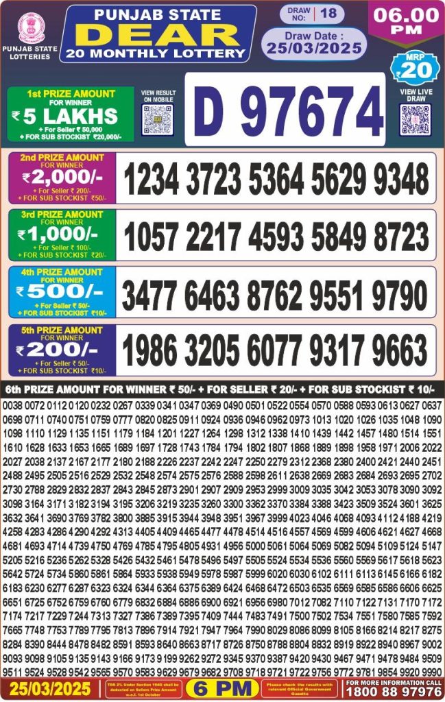 Punjab state dear 20 monthly result 6 pm lottery 25-3-25 Results Editorial Staff March 25, 2025 Leave a Comment on Punjab state dear 20 monthly result 6 pm lottery 25-3-25 Posted in Results Share: XFacebookPinterestRedditVKDiggLinkedinMix Related Results Punjab State Dear 200 Monthly Lottery 6pm Result 07-02-26 Punjab State Lohri Bumper Lottery Result 2026 Live Updates Dear X-Mas Bumper 6pm Lottery Result 27-12-25 Punjab State Dear 100 Monthly Lottery 7pm Result 09-12-25 Punjab State Lottery Dear 100 Monthly 7pm Result 11-11-2025 Dear 2000 Monthly Lottery 7pm Result 08-11-25 Check Now Dear Puja Bumper Lottery Result 11-10-25 Publish Author: Results Editorial Staff