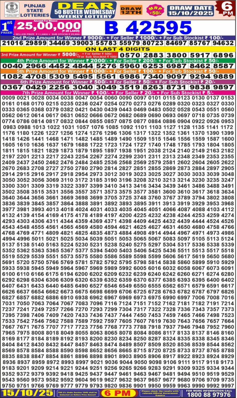 Punjab State Dear 50 Buster Wednesday Weekly Lottery 6 PM Result 15-10-25 0 Likes 4 Views Share now: XFacebookPinterestRedditVKDiggLinkedinMix Related Articles 0 2 Dear Blitzen Monday Weekly Lottery 6 PM Result 01-09-25 0 4 Dear dancer Thursday weekly lottery 6 pm result 1-5-25 0 5 Dear cupid wednesday weekly lottery 6 pm result 7-5-25 0 3 Punjab State Dear 50 Beast Monday Weekly Lottery 13-10-25