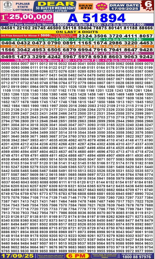 Punjab State Dear 50 Buster Wednesday Weekly Lottery 6 PM Result 17-09-25