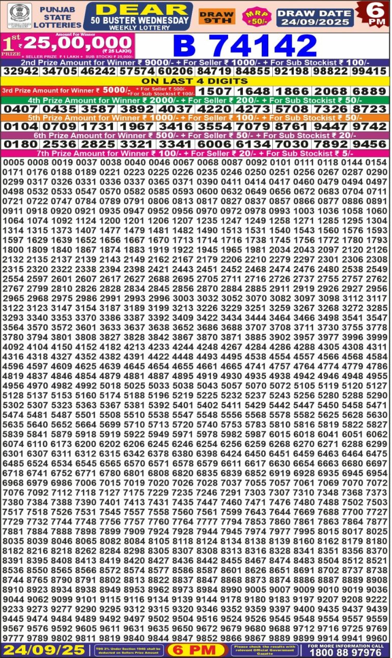 Punjab State Dear 50 Buster Wednesday Weekly Lottery 6 PM Result 24-09-25