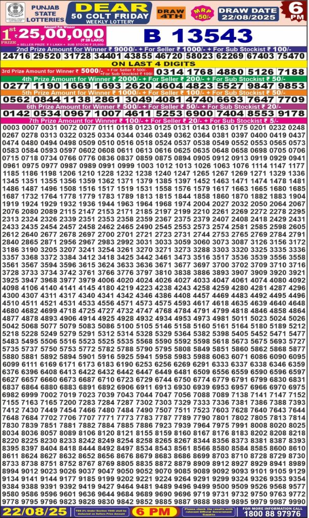 Punjab State Dear 50 colt Friday Weekly Lottery 6 PM Result 22-08-25 wpailnadmin August 22, 2025 Leave a Comment on Punjab State Dear 50 colt Friday Weekly Lottery 6 PM Result 22-08-25 Posted in Dear Lottery 6 PM Result Share: XFacebookPinterestRedditVKDiggLinkedinMix Dear Legend Monday Weekly Lottery Result Update 📅 Date: 22 August 2025 ⏰ Draw Time: 6:00 PM 🟢 Result Declared 🔗 View previous Dear Lottery 6 PM Result results Related Results Dear Legend Monday Weekly Lottery 6pm Result 02-03-26 Dear Empire Sunday Weekly Lottery 6pm Result 01-03-26 Dear Elite Saturday Weekly Lottery 6pm Result 28-02-26 Dear Crown Friday Weekly Lottery 6pm Result 27-02-26 Dear Supreme Thursday Weekly Lottery 6pm Result 26-02-26 Dear Regal Wednesday Weekly Lottery 6pm Result 25-02-26 Dear Prestige Tuesday Weekly Lottery 6pm Result 24-02-26 Author: wpailnadmin Website