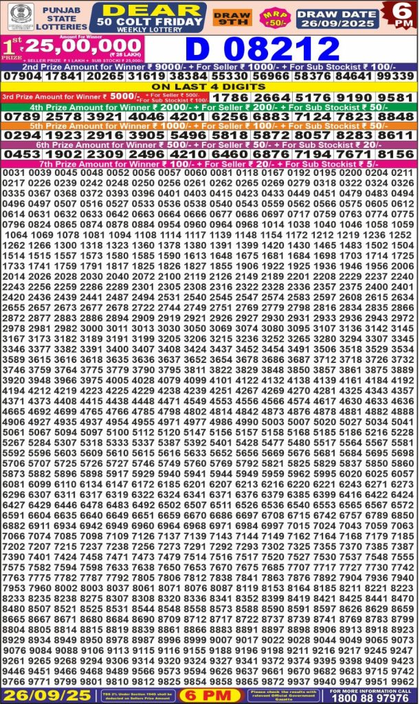 Punjab State Dear 50 colt Friday Weekly Lottery 6 PM Result 26-09-25