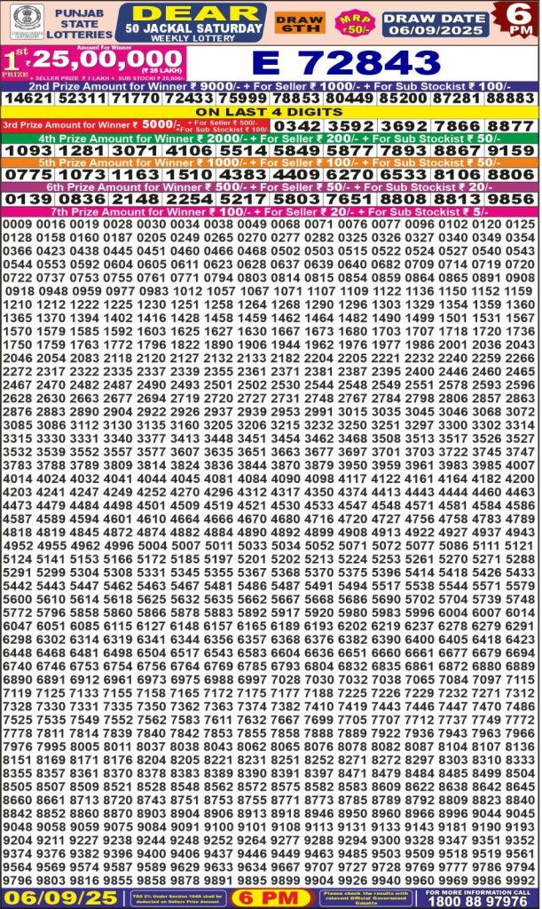 Punjab State Dear 50 Jackal Saturday Weekly Lottery 6 PM Result 06-09-25