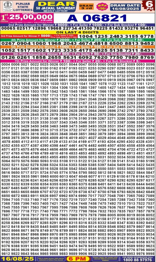Punjab State Dear 50 Jackal Saturday Weekly Lottery 6 PM Result 16-08-25 wpailnadmin August 16, 2025 Leave a Comment on Punjab State Dear 50 Jackal Saturday Weekly Lottery 6 PM Result 16-08-25 Posted in Dear Lottery 6 PM Result Share: XFacebookPinterestRedditVKDiggLinkedinMix Dear Empire Sunday Weekly Lottery Result Update 📅 Date: 16 August 2025 ⏰ Draw Time: 6:00 PM 🟢 Result Declared 🔗 View previous Dear Lottery 6 PM Result results Related Results Dear Legend Monday Weekly Lottery 6pm Result 02-03-26 Dear Empire Sunday Weekly Lottery 6pm Result 01-03-26 Dear Elite Saturday Weekly Lottery 6pm Result 28-02-26 Dear Crown Friday Weekly Lottery 6pm Result 27-02-26 Dear Supreme Thursday Weekly Lottery 6pm Result 26-02-26 Dear Regal Wednesday Weekly Lottery 6pm Result 25-02-26 Dear Prestige Tuesday Weekly Lottery 6pm Result 24-02-26 Author: wpailnadmin Website
