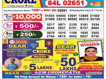 Punjab State Dear 50 Jackal Saturday Weekly Lottery 6pm Result 27-12-25 0 Likes 3 Views Share now: XFacebookPinterestRedditVKDiggLinkedinMix Related Articles 0 7 Dear vixen sunday weekly lottery 6 pm result 23-2-25 0 3 Dear Regal Wednesday Weekly Lottery 6pm Result 17-12-25 0 5 Dear blitzen monday weekly lottery 6 pm result 7-7-25 0 8 Punjab state dear 10 copper friday weekly lottery 6 pm result 11-7-25