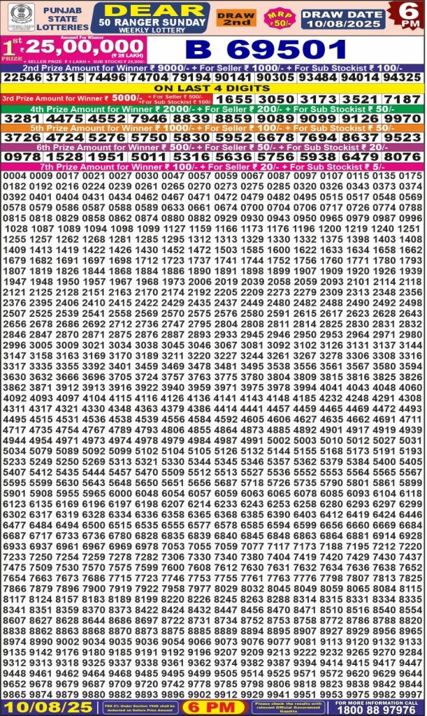 Punjab State Dear 50 Ranger Sunday Weekly Lottery 6 PM Result 10-08-25 Results Editorial Staff August 10, 2025 Leave a Comment on Punjab State Dear 50 Ranger Sunday Weekly Lottery 6 PM Result 10-08-25 Posted in Dear Lottery 6 PM Result Share: XFacebookPinterestRedditVKDiggLinkedinMix Dear Legend Monday Weekly Lottery Result Update 📅 Date: 10 August 2025 ⏰ Draw Time: 6:00 PM 🟢 Result Declared 🔗 View previous Dear Lottery 6 PM Result results Related Results Dear Legend Monday Weekly Lottery 6pm Result 02-03-26 Dear Empire Sunday Weekly Lottery 6pm Result 01-03-26 Dear Elite Saturday Weekly Lottery 6pm Result 28-02-26 Dear Crown Friday Weekly Lottery 6pm Result 27-02-26 Dear Supreme Thursday Weekly Lottery 6pm Result 26-02-26 Dear Regal Wednesday Weekly Lottery 6pm Result 25-02-26 Dear Prestige Tuesday Weekly Lottery 6pm Result 24-02-26 Author: Results Editorial Staff