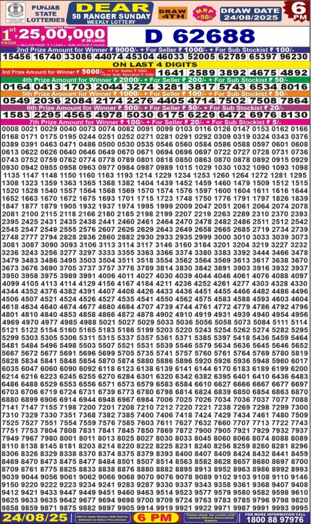 Punjab State Dear 50 Ranger Sunday Weekly Lottery 6 PM Result 24-08-25