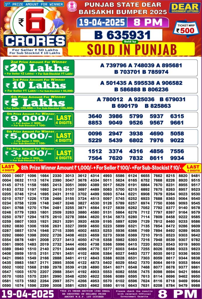 Punjab State Dear Baisakhi Bumper Lottery Result 19-4-25 Results Editorial Staff April 19, 2025 Leave a Comment on Punjab State Dear Baisakhi Bumper Lottery Result 19-4-25 Posted in Results Share: XFacebookPinterestRedditVKDiggLinkedinMix Related Results Punjab State Dear 200 Monthly Lottery 6pm Result 07-02-26 Punjab State Lohri Bumper Lottery Result 2026 Live Updates Dear X-Mas Bumper 6pm Lottery Result 27-12-25 Punjab State Dear 100 Monthly Lottery 7pm Result 09-12-25 Punjab State Lottery Dear 100 Monthly 7pm Result 11-11-2025 Dear 2000 Monthly Lottery 7pm Result 08-11-25 Check Now Dear Puja Bumper Lottery Result 11-10-25 Publish Author: Results Editorial Staff