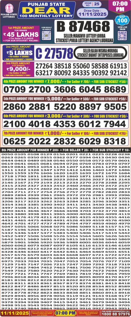 Punjab State Lottery Dear 100 Monthly 7pm Result 11-11-2025 Results Editorial Staff November 11, 2025 Leave a Comment on Punjab State Lottery Dear 100 Monthly 7pm Result 11-11-2025 Posted in Results Share: XFacebookPinterestRedditVKDiggLinkedinMix Related Results Punjab State Dear 200 Monthly Lottery 6pm Result 07-02-26 Punjab State Lohri Bumper Lottery Result 2026 Live Updates Dear X-Mas Bumper 6pm Lottery Result 27-12-25 Punjab State Dear 100 Monthly Lottery 7pm Result 09-12-25 Dear 2000 Monthly Lottery 7pm Result 08-11-25 Check Now Dear Puja Bumper Lottery Result 11-10-25 Publish Kerala Bumper BR-105 Lottery Result 04-10-25 Declared Author: Results Editorial Staff